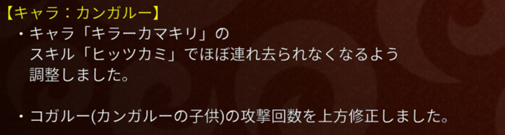 カンガルーは上方。カンガルーというと序盤中盤の牽制役というイメージ。はたして今回の調整でバトル開始直後の戦況に変化が現れるのでしょうか。
