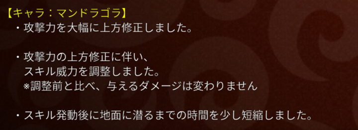 マンドラの攻撃力の大幅上方ですが、そのパーセンテージはなんと、36%半ば!!!!私自身は育ってないのでマンドラで大殺戮を楽しむことはできませんが、某うさぎ系実況者さんとかまたネタ動画を投稿してくれるのかな~(●´(ω)`●)♪