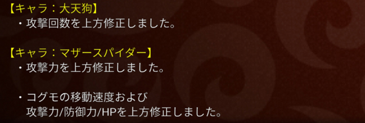 大天狗の攻撃回数は分間1回分の上方。なんとも微妙な上方ですね。一方のクモの攻撃力は8%弱の上方。コグモも上方し、イメージとしてはなかなか強くなってそうです。