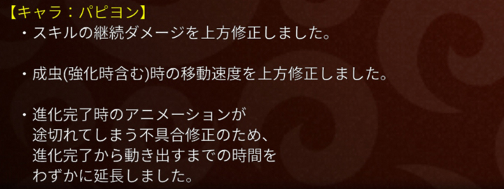 弱い弱いと言われているパピヨンのバッジがリリース1週間程でされています。その3週間後となる今回の調整で少し上方が入っていますね。