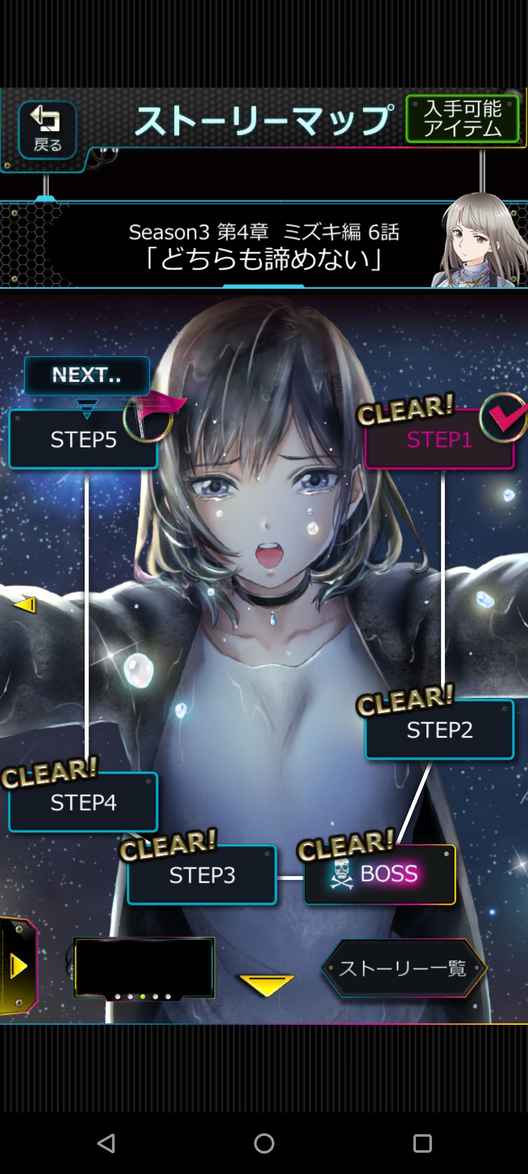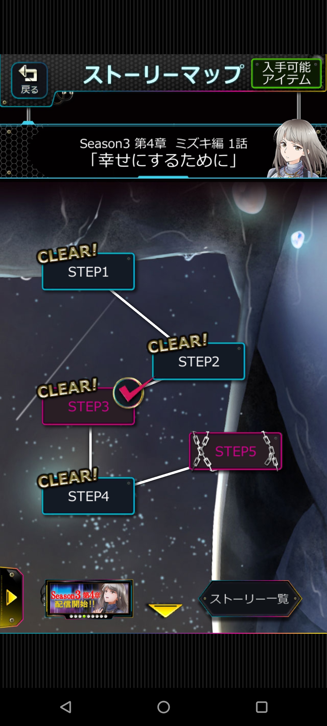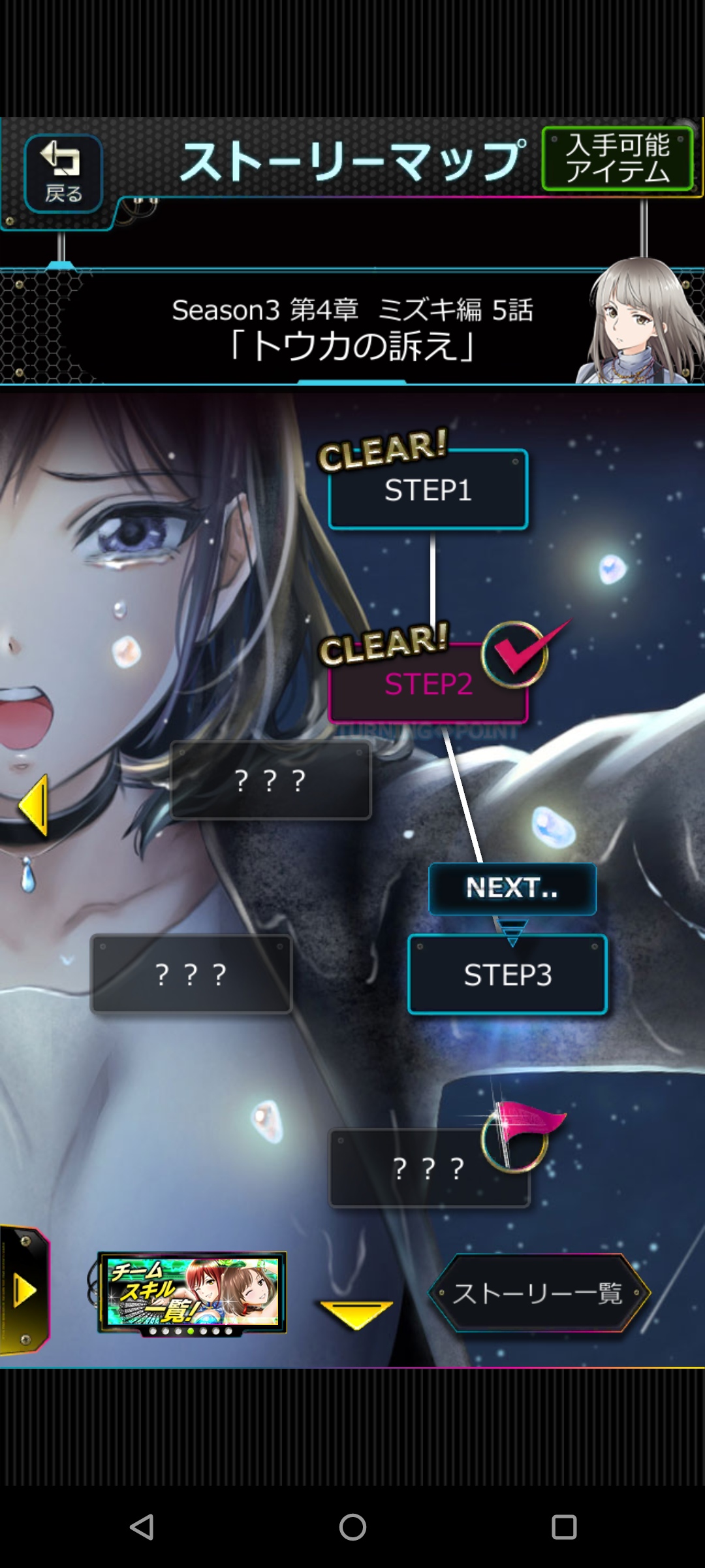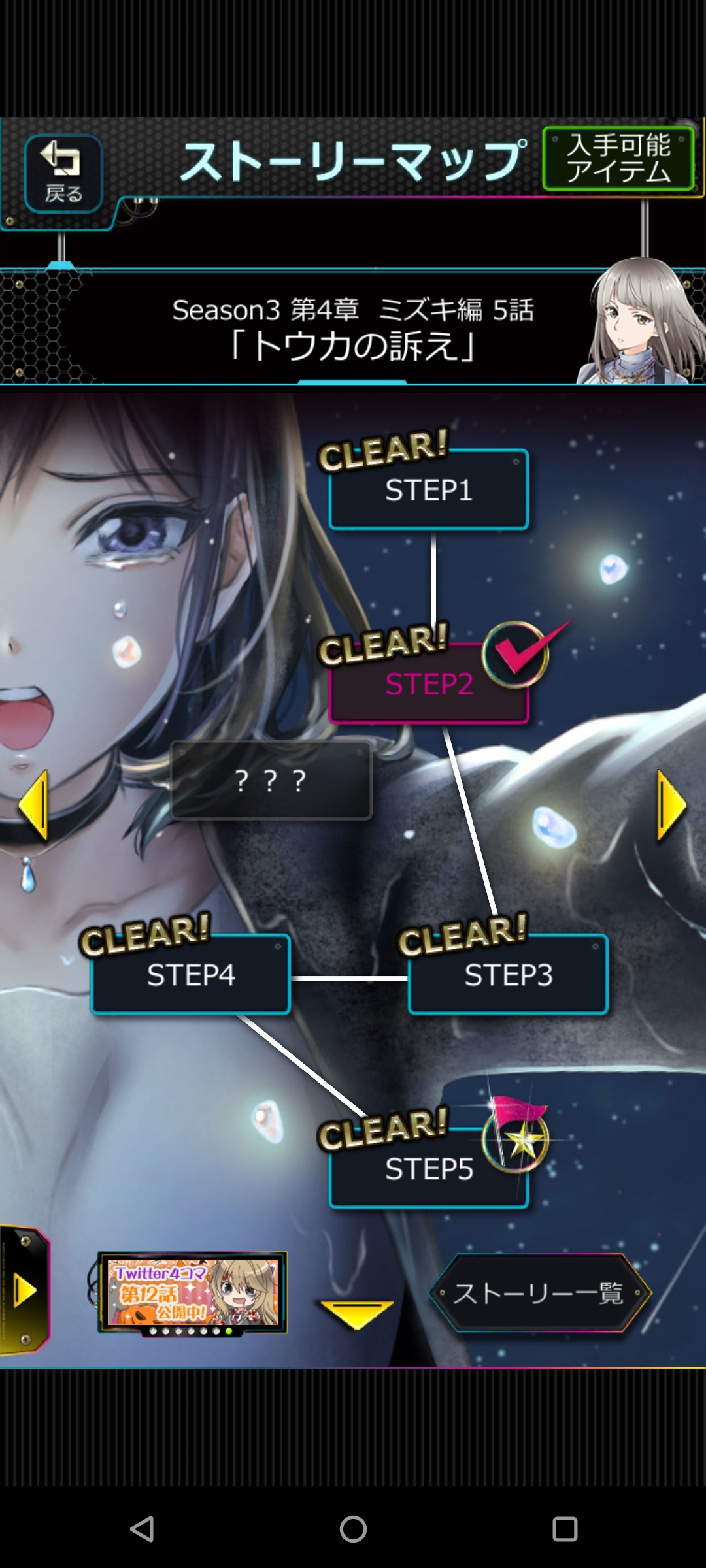 3話STEP5解放されたので進めます。2話STEP4の後からミズキ編が進んでいない方は進めちゃってください。5話STEP1まで一気に進めてOKです。