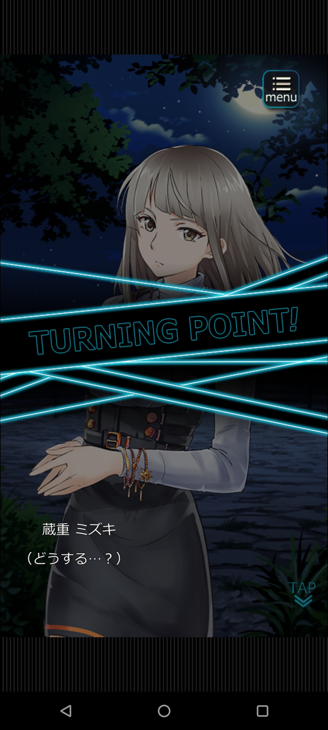 ということでTURNING POINTです。Bを選択が正解ですが、先刻お話したとおりまずミズキ編の2話STEP4を終えてからこちらにたどり着いてください。そうでなければ、たとえ正解のBを選択しても先へ進めません。そして、主人公編6話STEP2を済ませると、今度はミズキ編3話STEP5が解放されます。