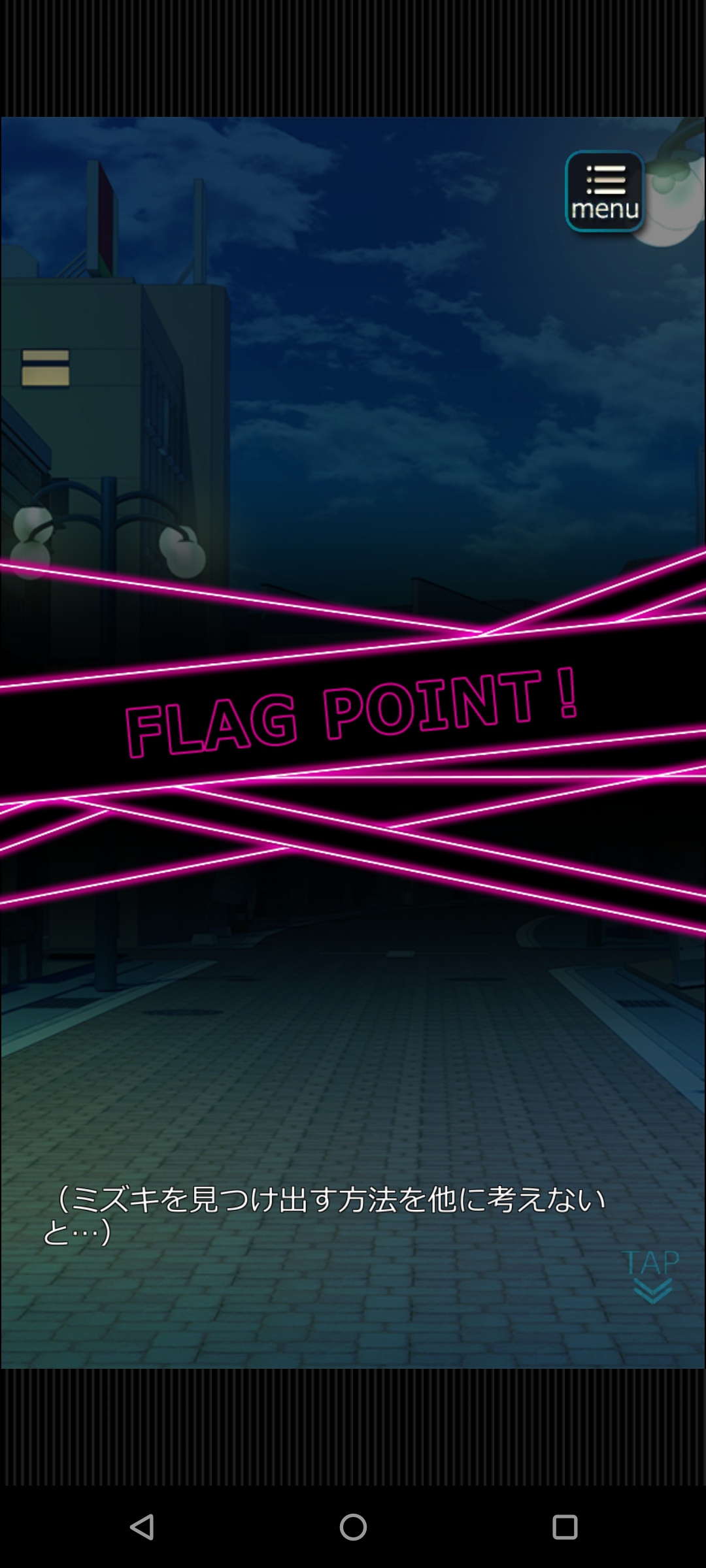 主人公編6話STEP2のあと7話まで行くとSTEP1でFLAG POINTに当たります。ここではBを選択するのが正解で、ミズキ編5話STEP2のルートに変化が起こります。読了後、ストーリー選択画面に戻ると主人公編7話STEP2は施錠されており次に進めないので、ここでまたミズキ編に移動することになります。