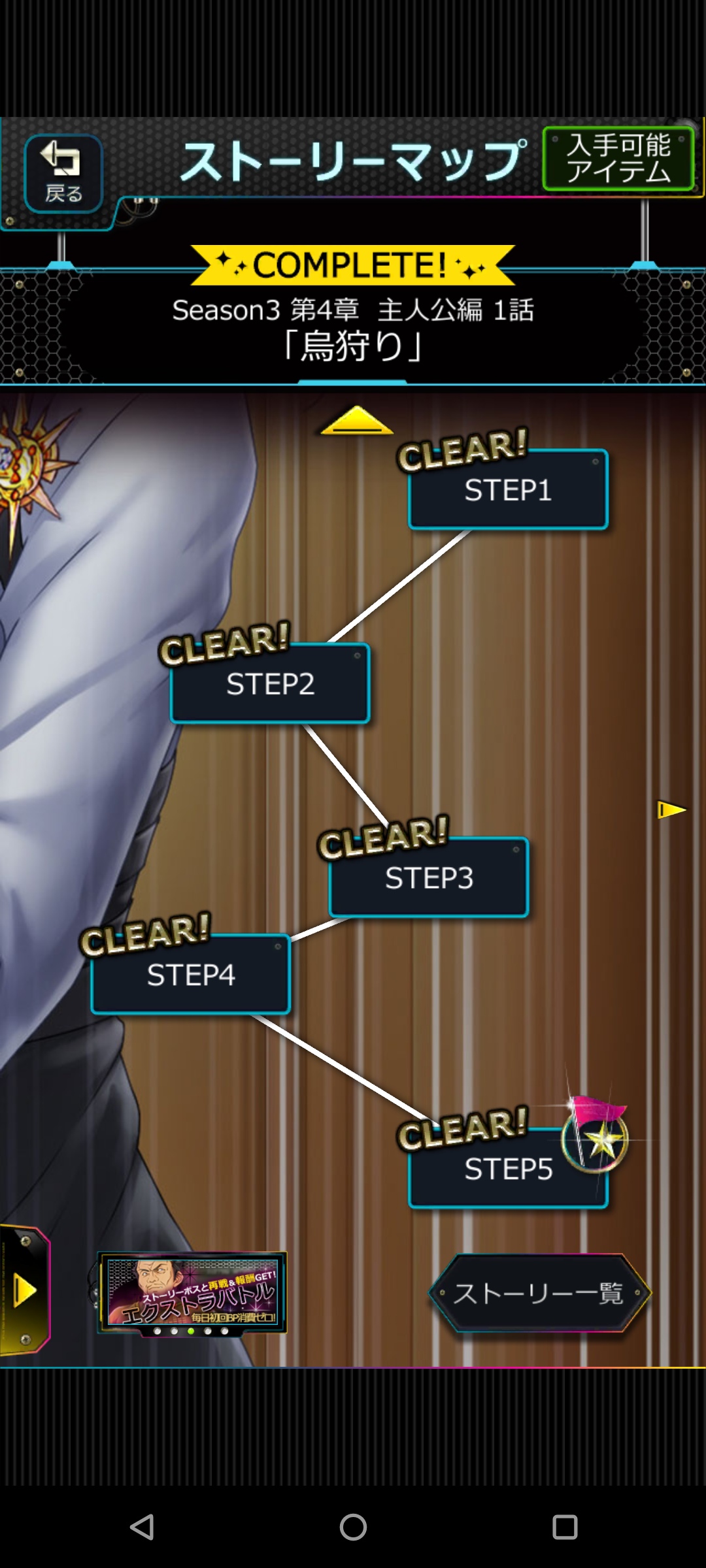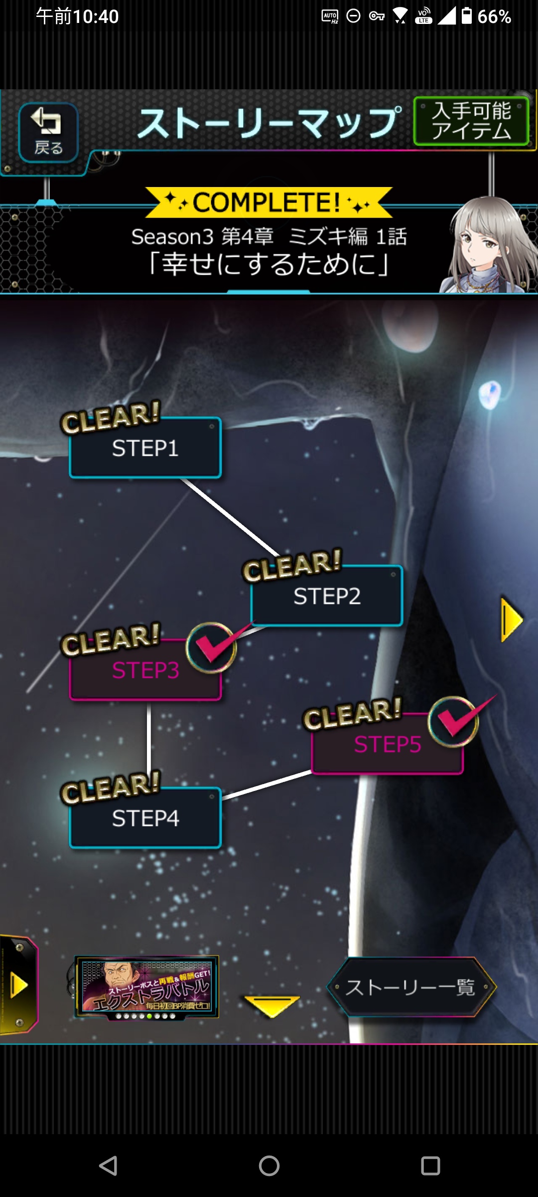 まずは主人公編から行きましょう。1話を最後まで進めるとミズキ編の1話STEP3が解放されます。