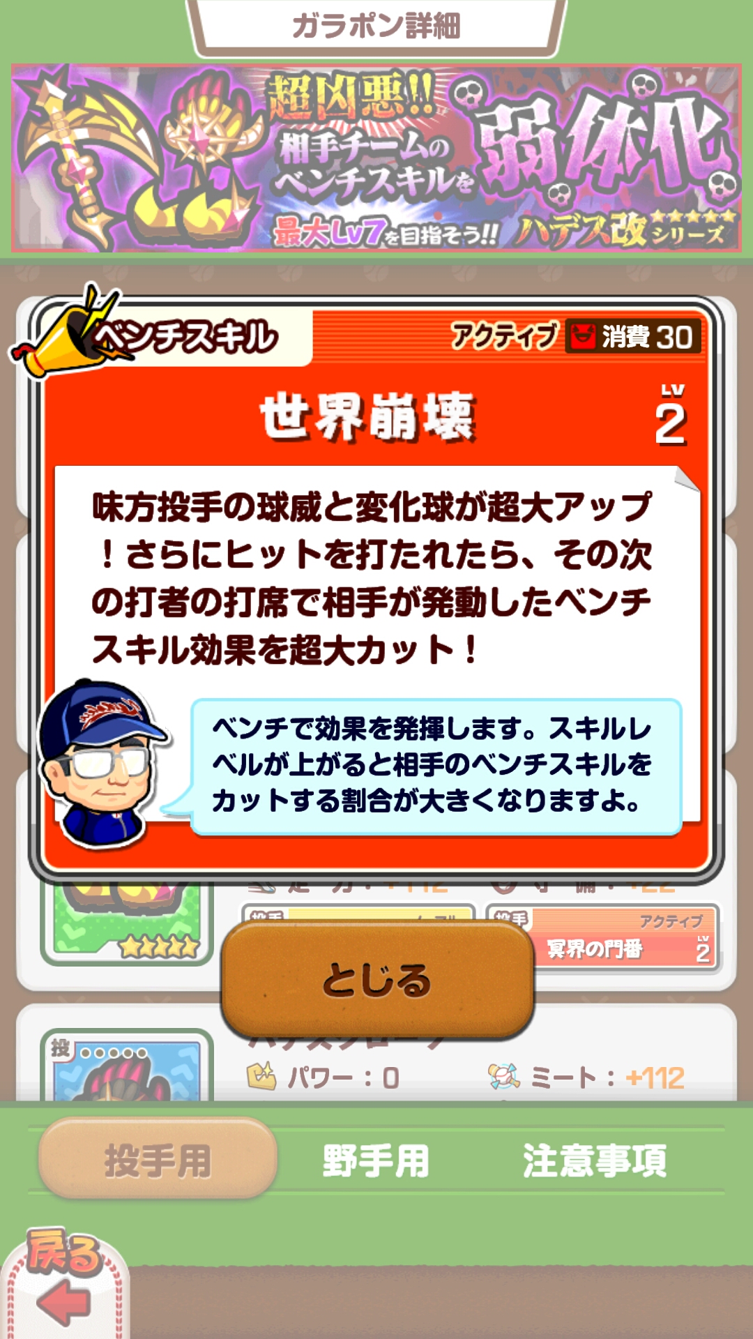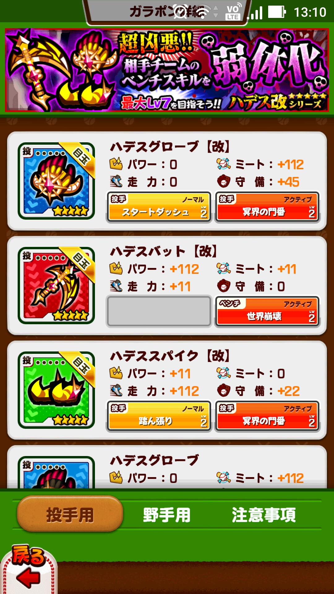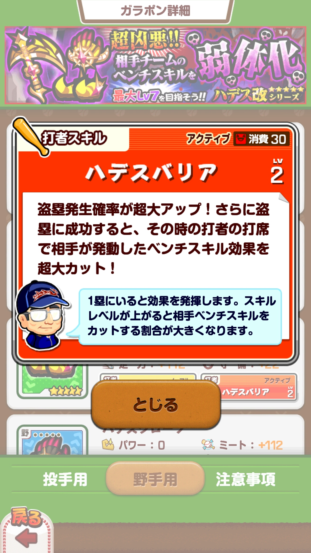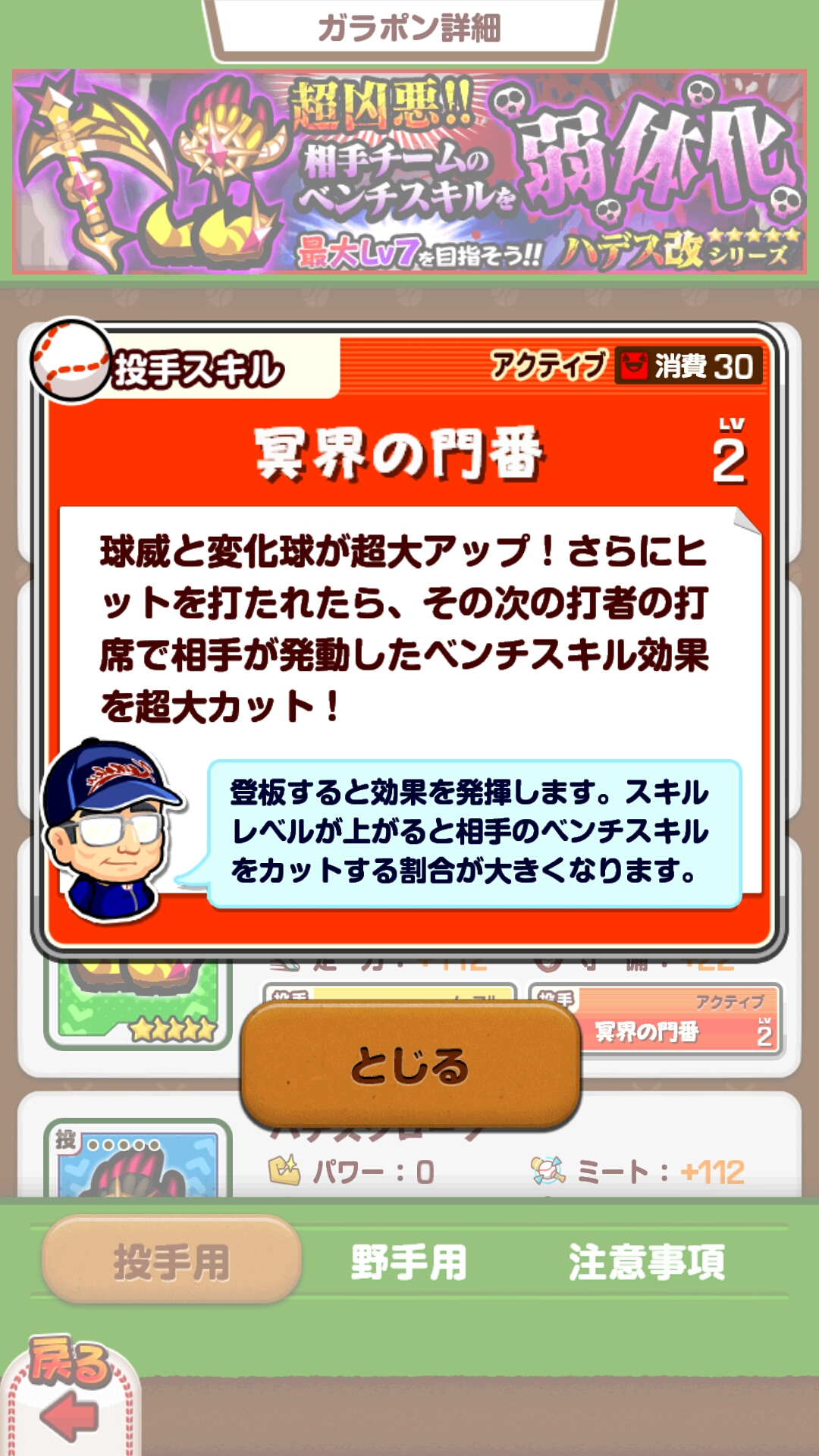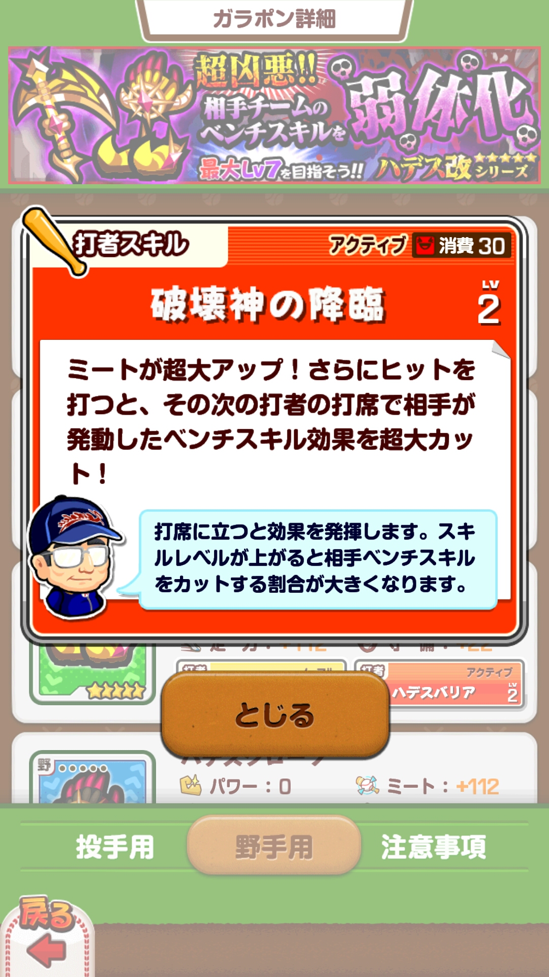 そして、このハデスは今回初めて「改」が登場しました。改とは何かを端的に説明すると、通常レベル6までしか作れない☆5装備を、同じ☆5でもレベル7まで作るために出てきた改良された装備。これでレベル7の投手やベンチが相手に居たらかなりめんどくさいですね_(´(ェ)`_)⌒_)`