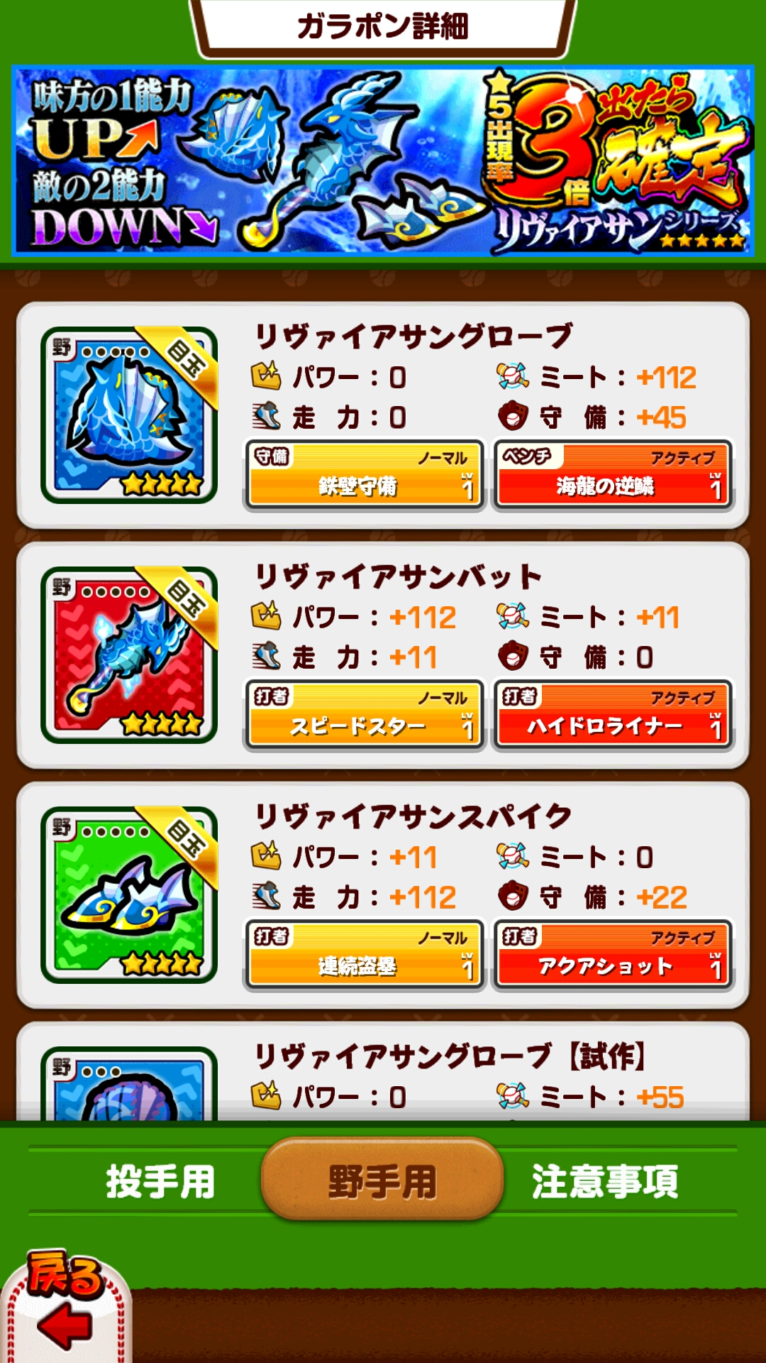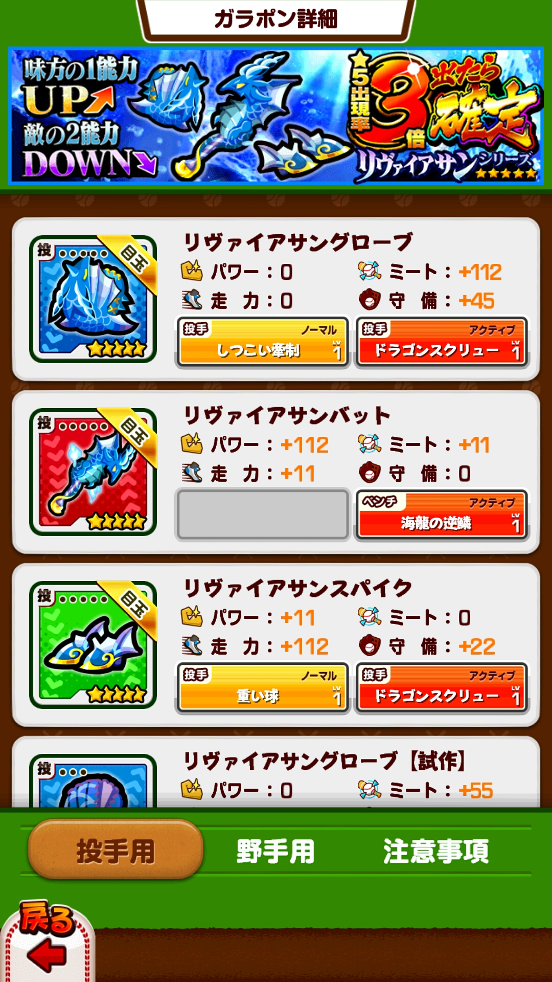 こちらはどれも「並」ということで3つ星です。能力の特徴は「味方の1能力アップ&敵の2能力ダウン」。なかなかクセのある装備ですよね?私もこのバットを持ってますが、使い方が難しいんです。