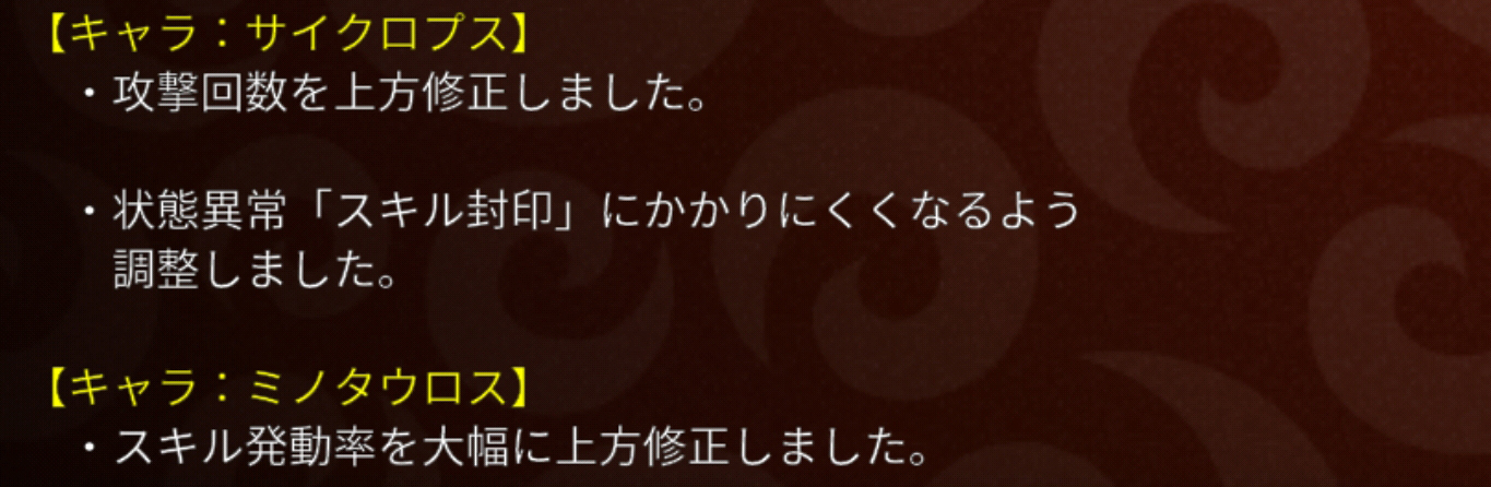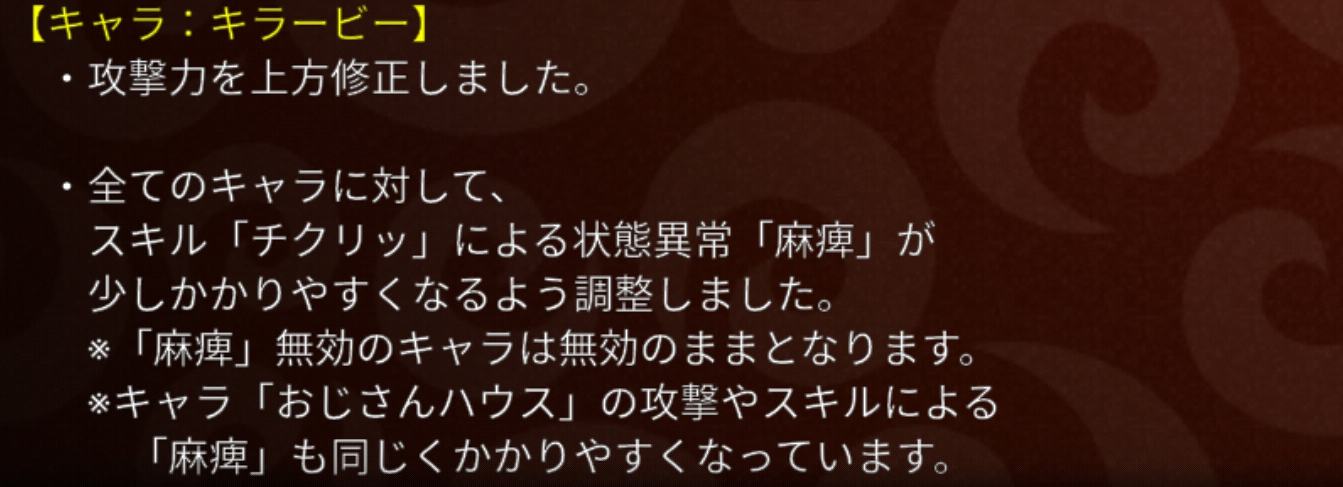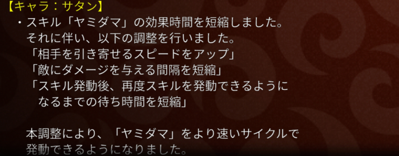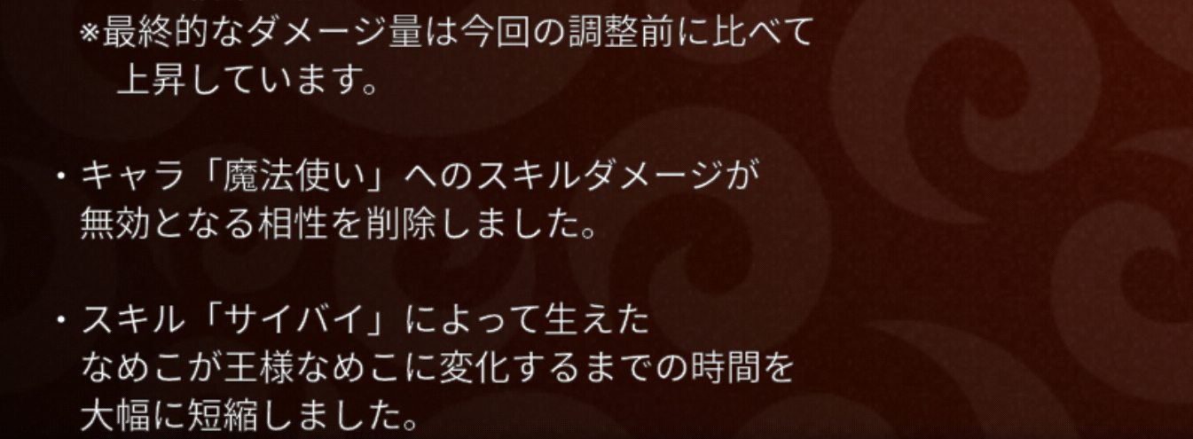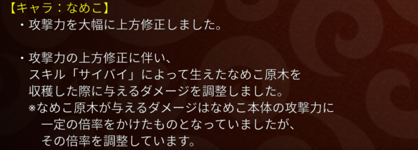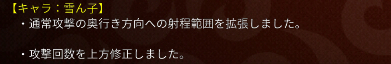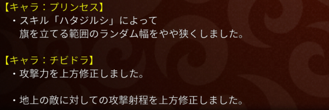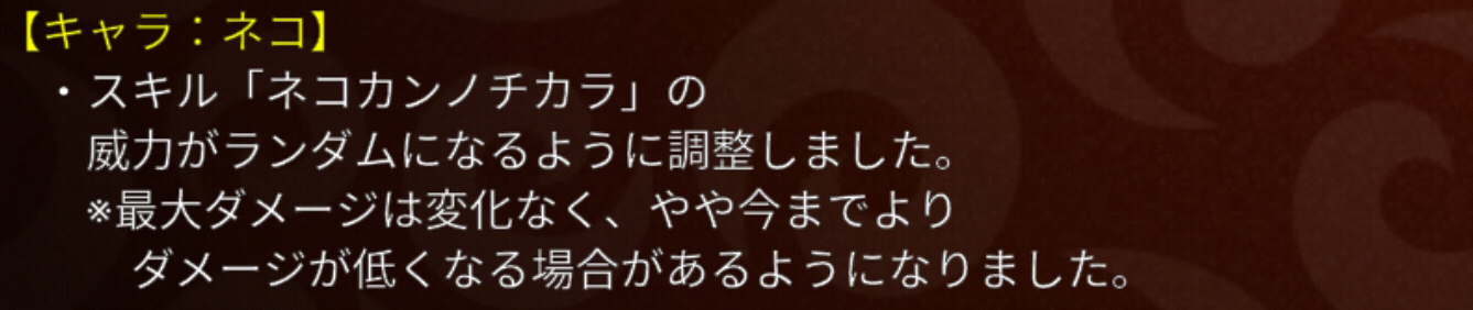 この時点では「キャラの性能に変更はありません」との表記がありますが、最新の修正でスキル発動位置のランダム幅がやや狭まっています(少し下にスクロールすると確認できます)。わかりにくいですが、やや使いやすくなったということです。