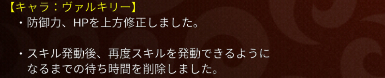 ヴァルキリーまーた上方ですね。どんどん上方してる。うなぎのぼりだよ( ゚д゚)そんなに使用率低いのかな?この書き方だとスキル連発することもあるって話ですよね。今の所あんまり遭遇しないけれど耐久力も上がってるし、さすがにヤバそう。しかも2体居るケースもあるんだよな・・・。