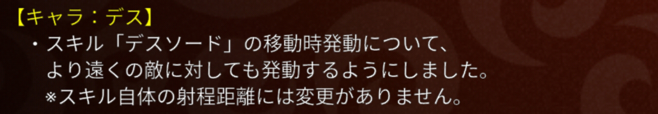 通常攻撃よりスキルの射程が広いキャラ「デス」。この修正により新キャラらしく環境をとるようになったことは間違いなく、今では使用者がグンと増えています。もう2週間以上前の修正なので、今実感していることを挙げるとすると、マルチ時に味方がデスだと非常に助かるということ( ・ิω・ิ)特に、敵大型を倒した後にその奥の砦を取りに行きやすいのが魅力だと感じています。