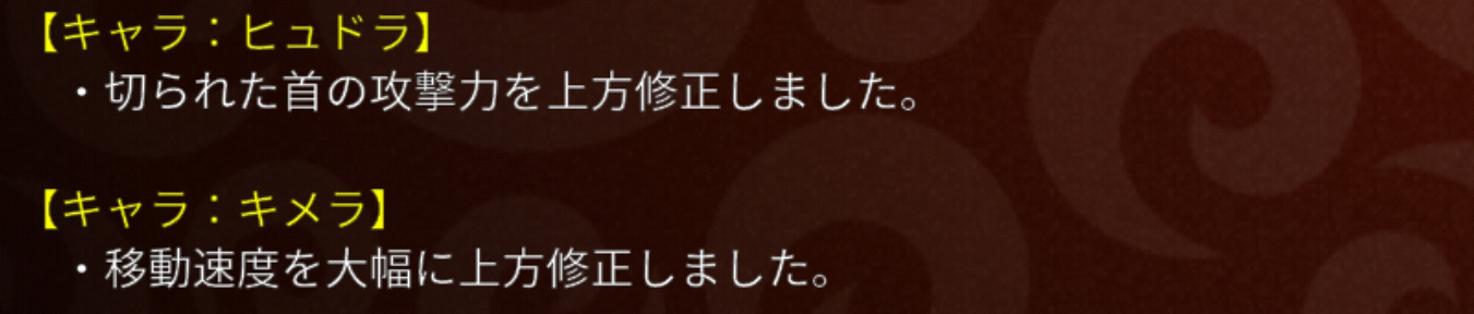 ヒュドラの首はソコフル?の金バッジで剣士1確との情報を見かけました。私自身はヒュドラを育てていないし、敵に居たら絶対イヤ・・・。終盤に首飛ばされて、こちらのコストがカツカツだった時とか想像したくない(´º∀º`)ファーw また、キメラは移動速度が200から300にアップ。ヒュドラと打って変わってこちらはアビ3スキル11まで育てているので、色んなシーンで早く使ってみたい気持ちがありますщ(・(ェ)・´щ)