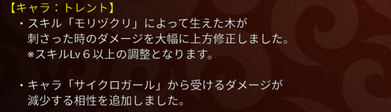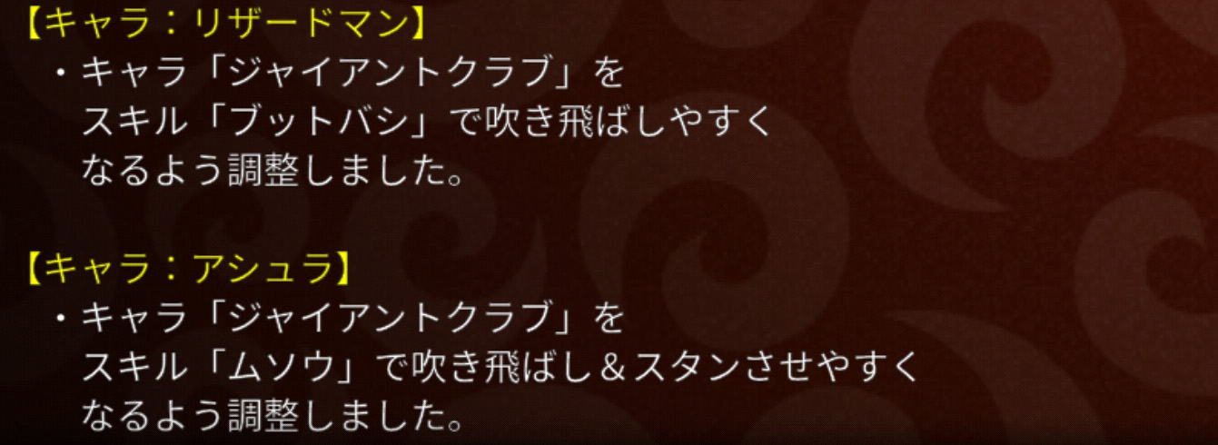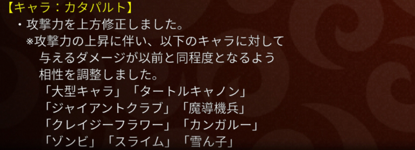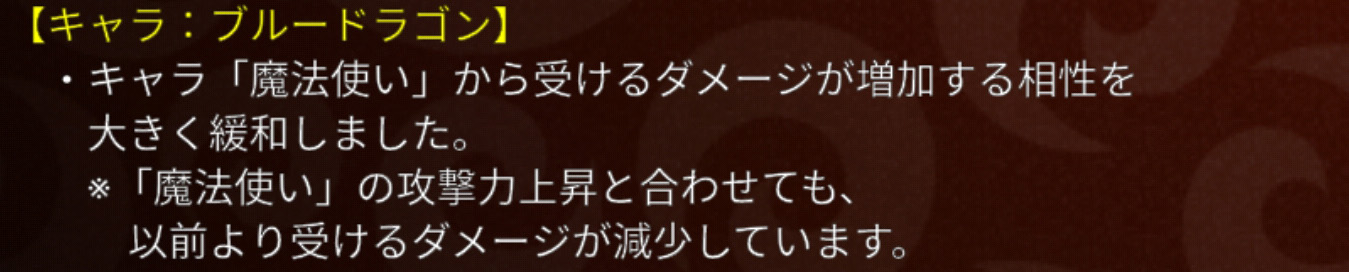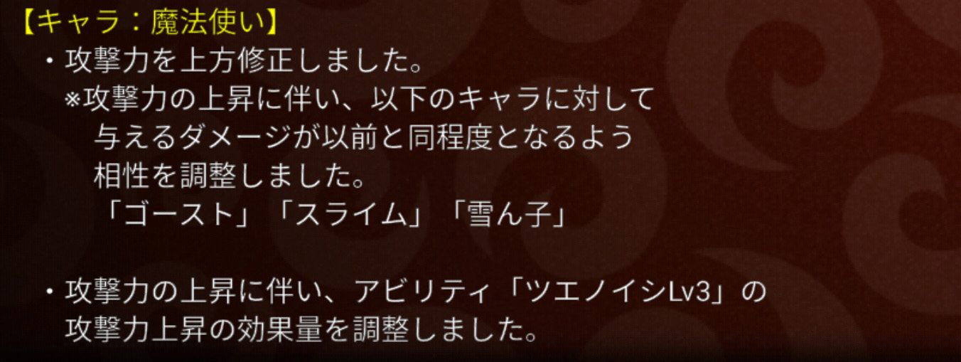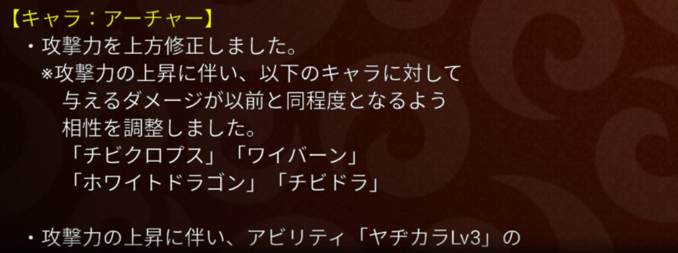 アーチャーと魔法っていつも情報量が多い気がするなぁ・・・。それはさておき、通常攻撃が上がった分、相性やアビ3を微妙に下げましたよっていうよくあるパターンの調整です。攻撃だけ30フルになっている自分の魔法使いをチェックしたらちょうど20上方していました。おそらくアーチャーも同じ数値の上昇でしょう。次に書いている、レドラやブルドラとの相性もだいぶ緩和されてしまっており、そこも踏まえるとアーチャーや魔法を使用するメリットがかなり減ってしまったようにも見えます。しかしながら、相性調整の部分で記載にないキャラ(アーチャーならドラライ、魔法なら魔導やロボ、ゴス等)に対しては、自らの通常攻撃力が上昇した分、以前より優位に立てるようになったともいえ、使いやすくなったとも言えます。結論として、攻撃のみ30フルにした状態で育成を止めている私は、補欠には入れずこのまま使い続けようと思うところです。