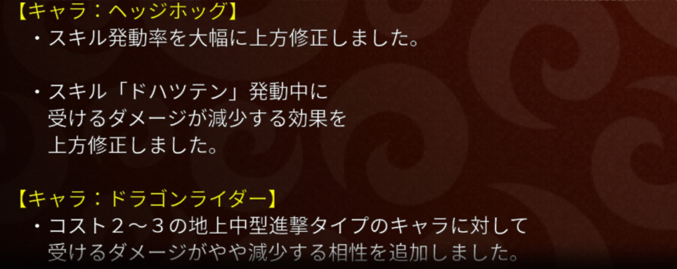 どちらも私のBOXでは中核を担うキャラのひとつです。ともに大きく上方しましたが、注意したいことが。まずヘジホは、今回マーメイドやメデューサも上方修正されたことでアンチであるそれらの使用率も増えることを加味すると、決して一方的に使いやすくなったわけではないということ。ドラライも同様で、先述したアーチャーに上方が入っているため相対的にみればドッコイドッコイ。とはいえ!それらの上方修正された苦手キャラが相手に居なければ戦況はかなり有利なわけですから今後も主戦力として使っていくつもりです。( ´(ω)`)。o○(ぶっちゃけ、ワイの金バッジヘジホがコスト勝ちしまくる未来しか見えない