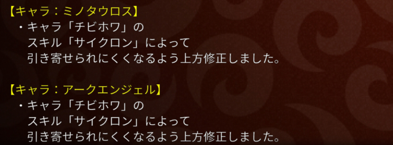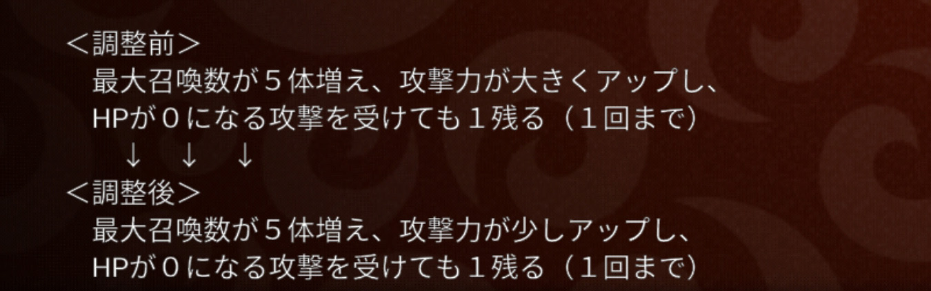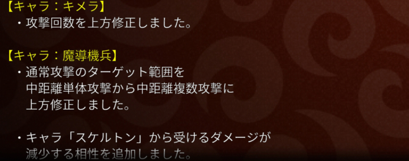 ここだけへんてこな組み合わせですね( ゚д゚)・・・。キメラは攻撃回数が4回増えました。これまではデスやガール、D0ロボ、上方されて強くなったナスやリリス、ホワドラの使用などが多かったので、キメラのような接近戦勝負がスタイルのキャラは使い方を誤ると遠隔からジリジリやられることもしばしばあったのではないでしょうか。現に私も最近はアビ3D0キメラをチョイスするのは討伐をやるときぐらいでした。で、上方。うーん。これでも使う気になるかはちょっとわかりません。だって、ブラドラ出るしw また、魔導機兵についてはさりげなくかなり良い上方修正です。シャークが以前全体→単体に下方された経緯がある一方で、こちらは単体から複数に上方。全体と複数では全体のほうが範囲が広い(単体<複数<少数<全体)ですが、それでも魔導をしっかり育てているユーザーにとっては嬉しい修正ですね!私の魔導はまだ30フルではないものの、今までも選出枠には入っておりこれから30フルにするかどうかも検討したいところです。スケルトン耐性がついたのも個人的には本当に嬉しいポイント!(キャラ数多くて瞬間火力のあるスケがけっこう苦手なもので・・・。