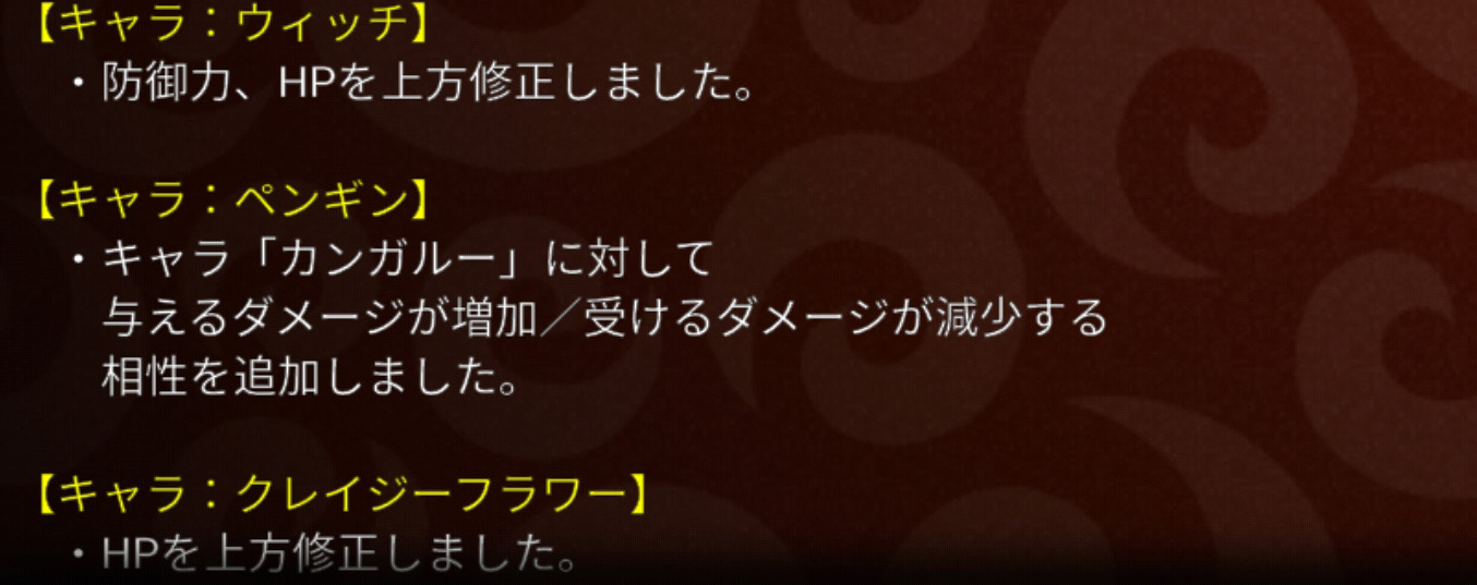 ウィッチの防御・HPは80ぐらい上がってましたかね?これはどなたかのツィートで拝見しました。また、ペンギンは対カンガルーにいいキャラになりました。ソロだとカンガルー本当に苦手なので、途中まで育てているペンギンを育成再開するのもひとつアリかなと思っています。最後にクレジーフラワーですが、HPの上昇値はまだ確認できていません。「大きく」とか「やや」といった表現がないので、おそらくウィッチのように100ポイント前後かな?
