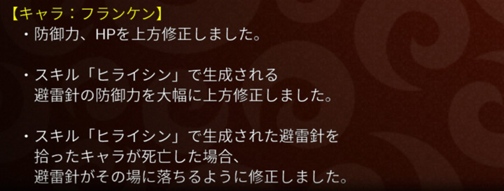誰もが上方すると読んでいたであろうキャラ、フランケン。一気に生まれ変わったらしいですねw(´º∀º`)ファーw 動画もいくつか拝見しましたが、戦場を支配するという感じではなく、じわりじわりと相手の勢いを奪っていくキャラという印象を受けました。なかでも、避雷針を付けていたキャラが倒された後も避雷針だけはその場に残れるようになったことの影響が大きく、敵からすれば残された避雷針の処理までこなさないといけない手間が増えました。放っておいたら付近の自キャラに一定間隔でダメージが入っちゃいますからね。ということで、これが本来のフランケンと思えばなかなかおもしろいキャラなのかもしれません。まぁ私はそれでも孵化しませんが…4コス重いし……。