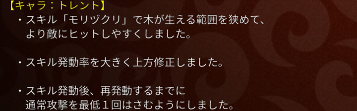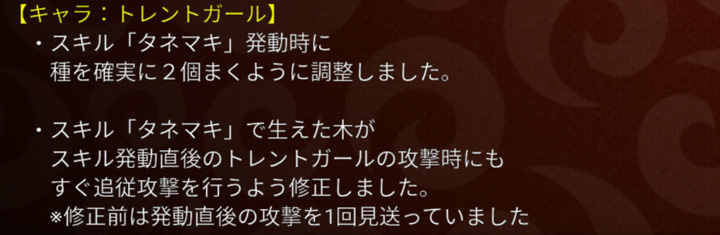 トレガのリリースによりトレントにも上方入るのかな?と予想していたら先週は入りませんでした。「あれ?」と思っていたところでの翌週である15日(金)に上方。内容で目を引くのが、木が生える範囲を狭めてより敵にヒットしやすくなったこと。スキル1回あたり10本ぐらいの木が出現していると思いますが、範囲が若干狭まったことで文字通り当たりやすくなったといえます。さらにはスキル発動率も大きく上方。トレント一族の上方は一体いつまで続くのやら( ゚д゚)ポカーン