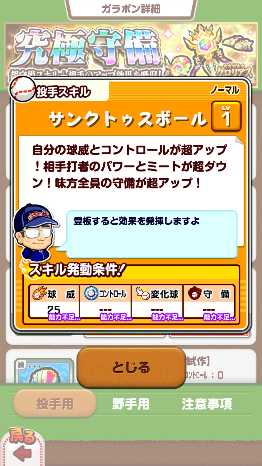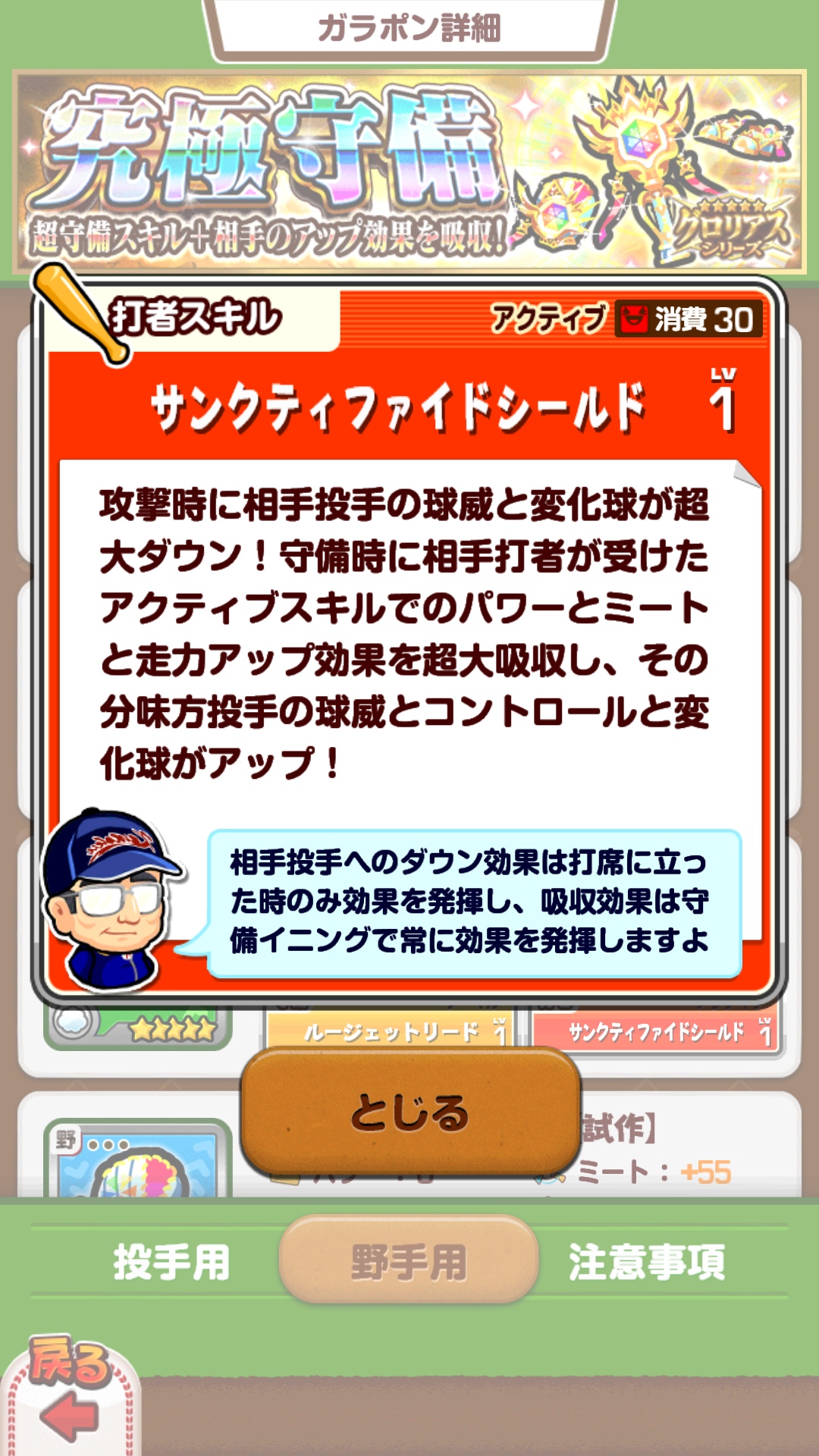 また、野手装備に関してはノーマルスキルがこれまた面白く、メイン装備にすればアクティブスキルとの相乗効果により攻守両面でさらに強力になります。そういった観点から主にミドル以下のリーグに所属している方なら実質5つ星の感覚であってもおかしくないかもしれません(マスターはメダル装備による高ステータスが主流のため考慮に入れず)。さらに、スパイクのノーマルスキルに関しては捕手用になっているところも究極守備を唱うこのシリーズらしさが表れていますね(●´(ω)`●)