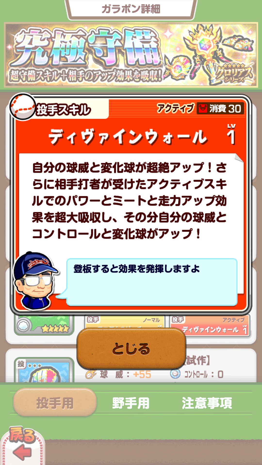 一方で、投手装備は基本の効果となる球威・変化球アップがLv6でもう超弩級に達します。これに加え、例の特徴的な効果で相手から吸収し自身の球威・コントロール・変化球が上昇するので上げとしては申し分ない強さと判断できます。よって、初回登場から5つ星と判断致しました。